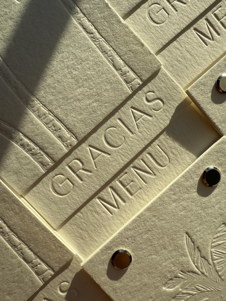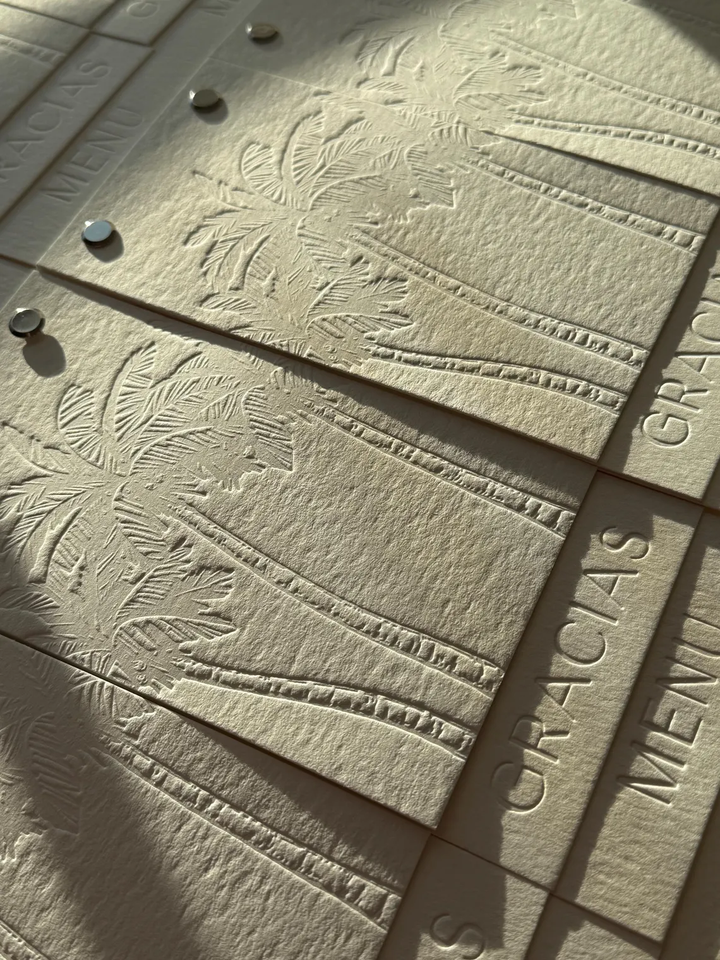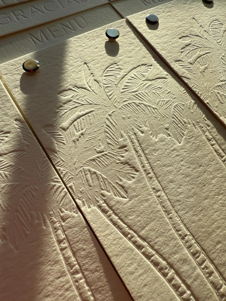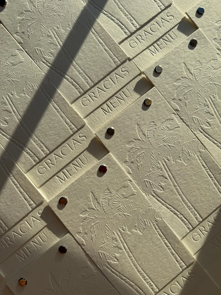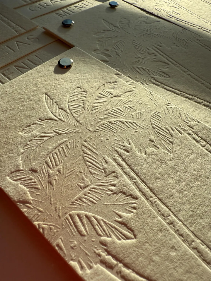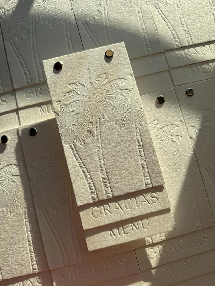 Menú de Boda Hecho a Mano en Papel de Algodón con Textura Natural de Palmera, con Grabado en Relieve, Estilo Costero para su Evento