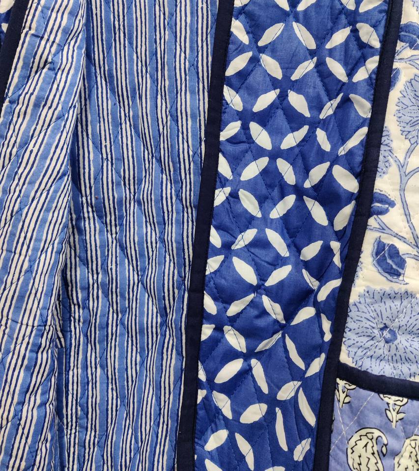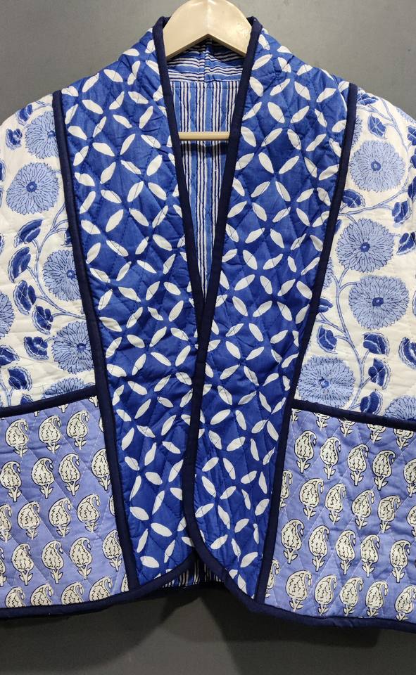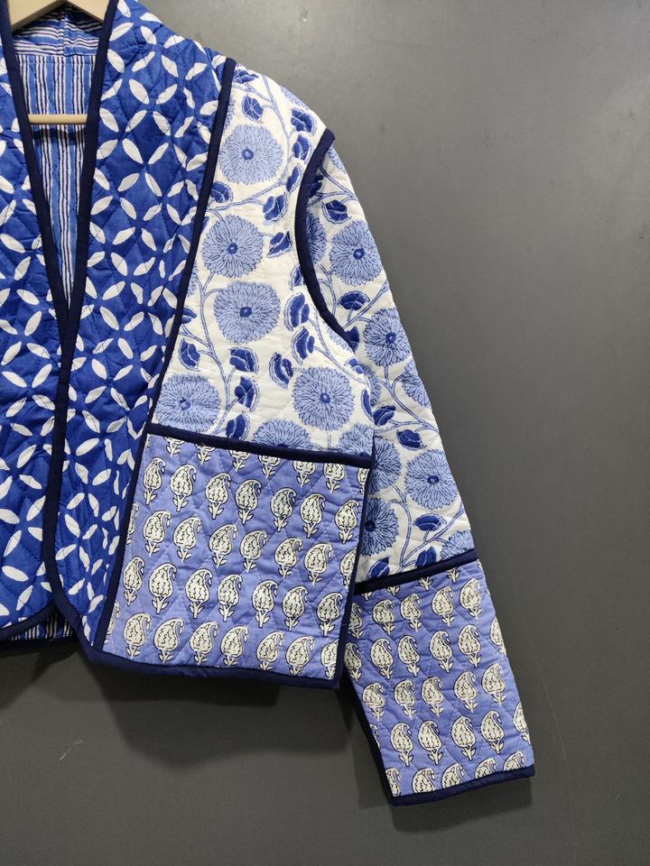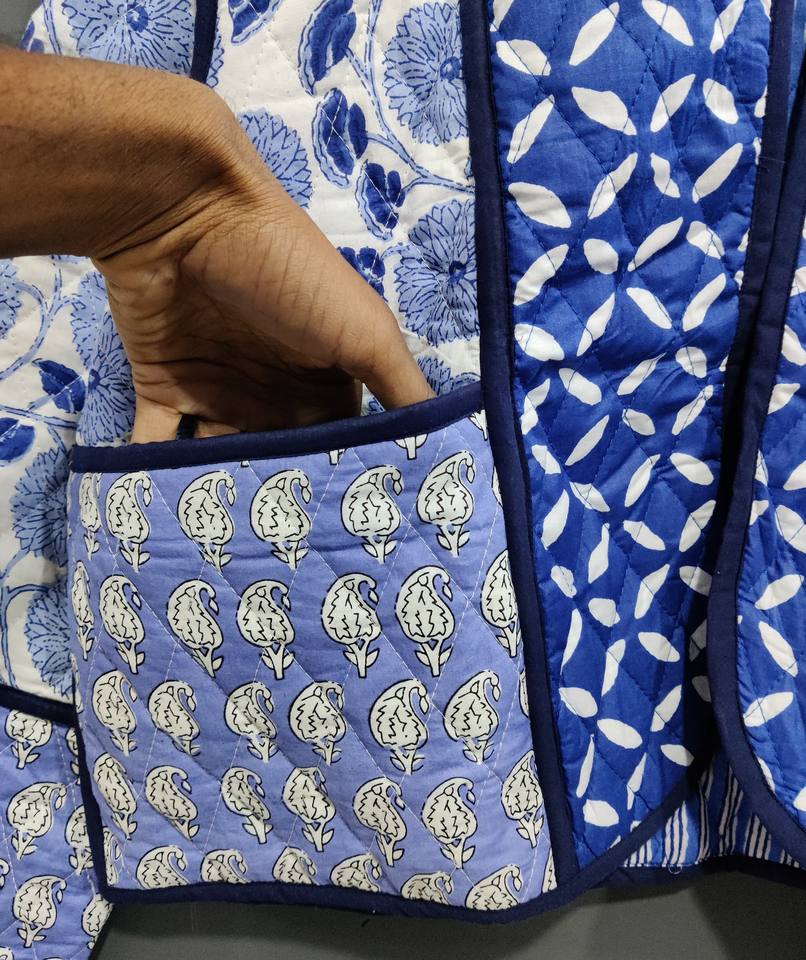 Chaqueta de trabajo con parche impreso de bloque de mano acolchada de algodón hecha a mano, chaqueta Unisex con bolsillo frontal abierto y borde libre, ropa acolchada