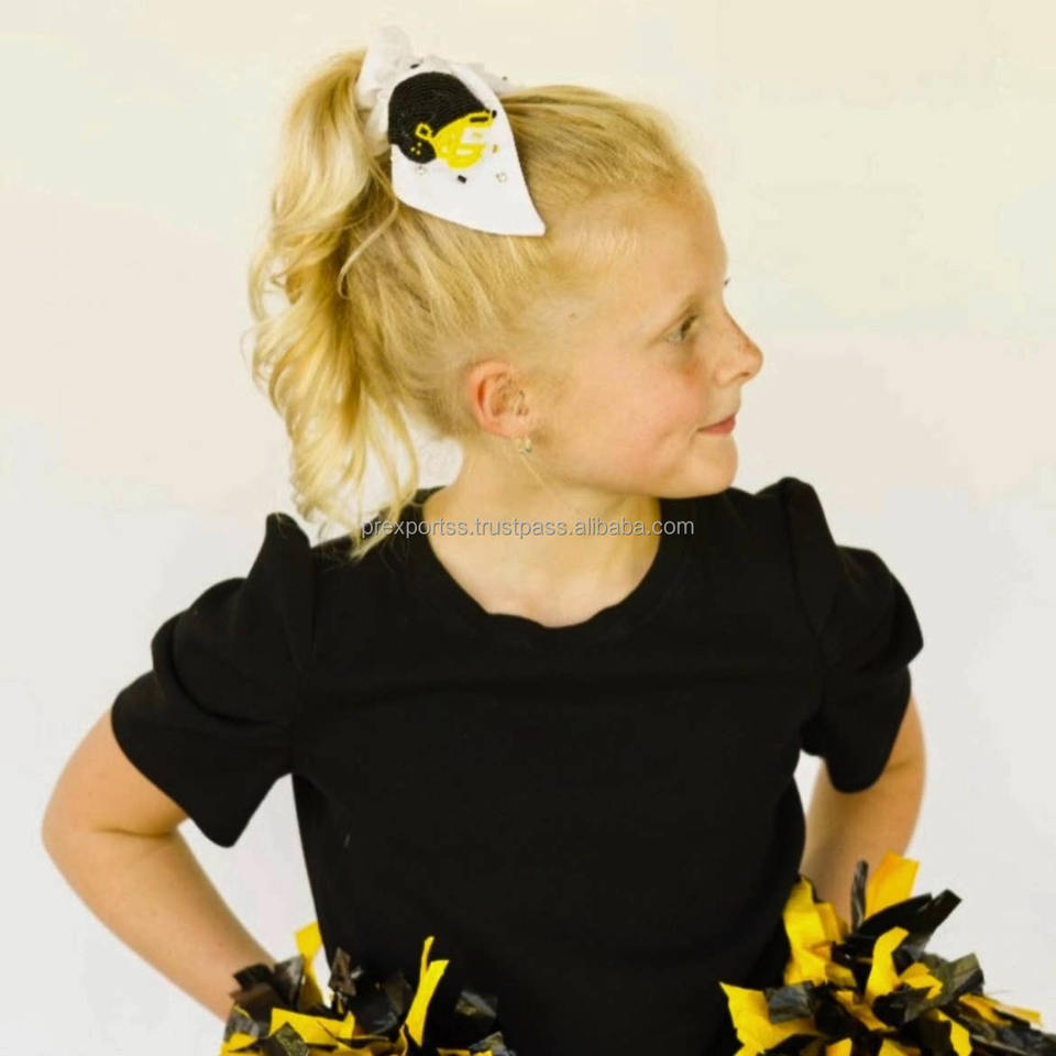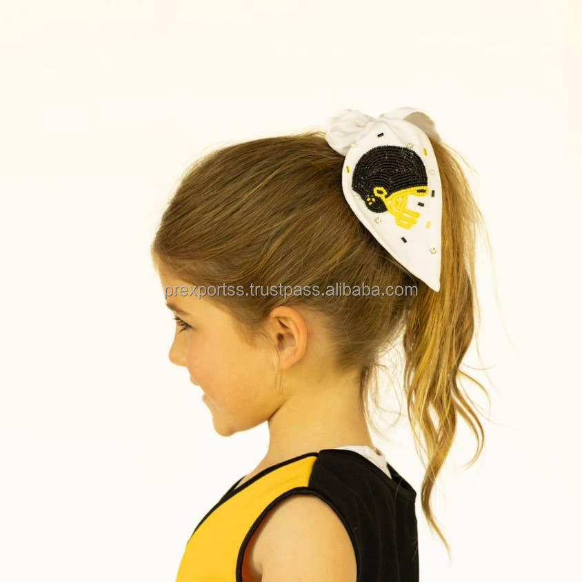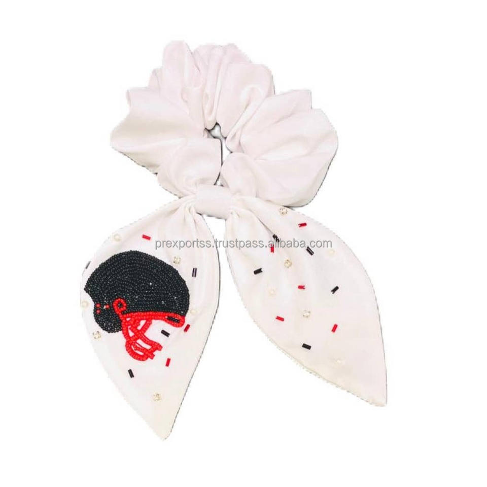 Hecho a mano personalizado bordado lazo del pelo opaco superior blanco Scrunchie con cuentas casco de fútbol elástico Cola de Caballo titular algodón satén