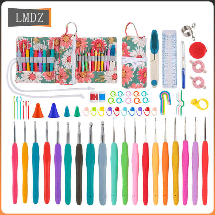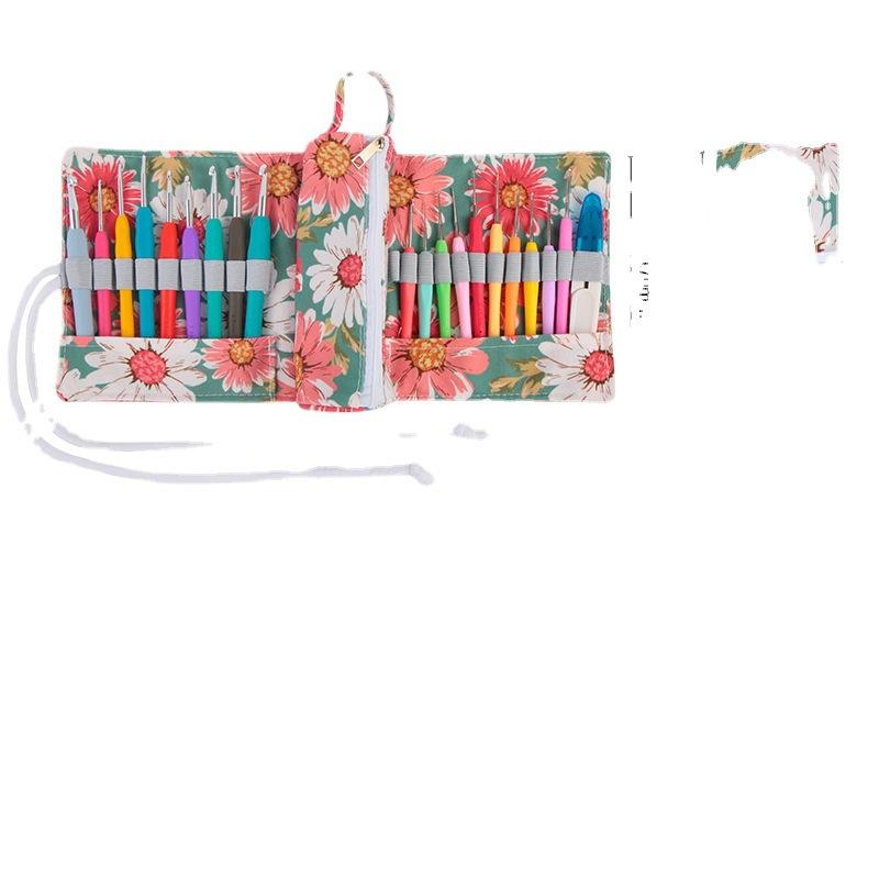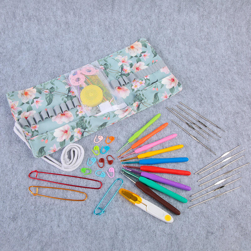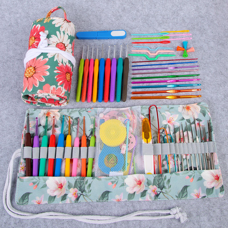 Herramientas de tejer DIY hechas a mano para Amazon, ganchos de ganchillo de aluminio transfronterizos, mango de goma, juego completo de bolsas de rollo, hilo al por mayor