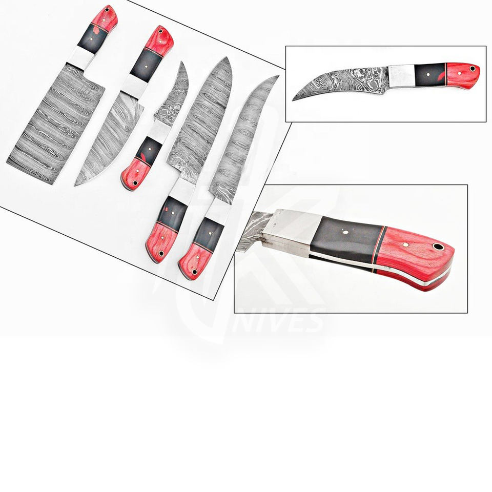 Juego de Cuchillos de Chef de Acero de Damasco Hechos a Mano con Mango de Madera, 5 Cuchillas, Empaque Personalizado OEM, Cuchillo para Acampar