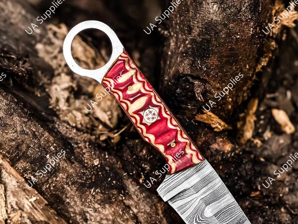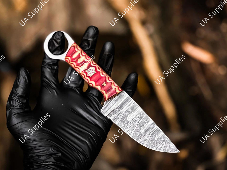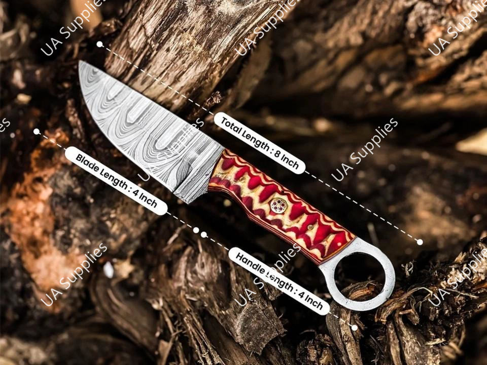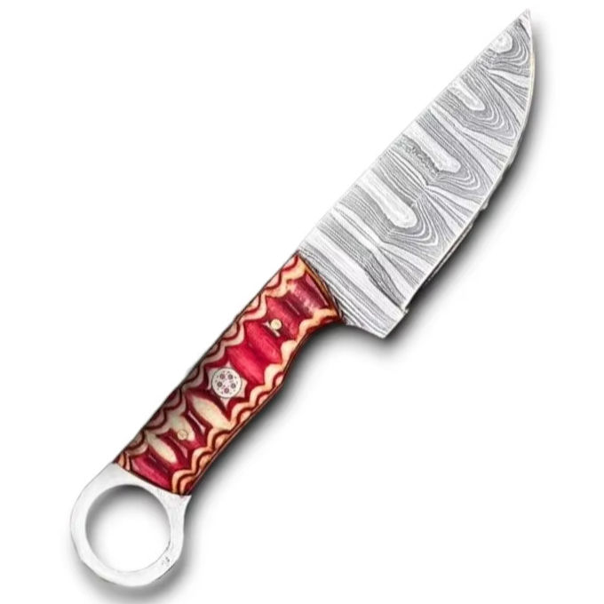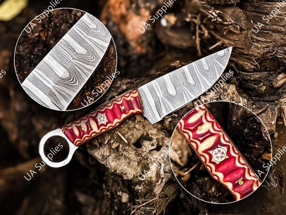 Cuchillo de Camping de Hoja Fija Hecho a Mano de Acero de Damasco con Punta Clip y Orificio para el Dedo, Afilado como una Navaja, Mango de Madera Pakka y Funda de Cuero