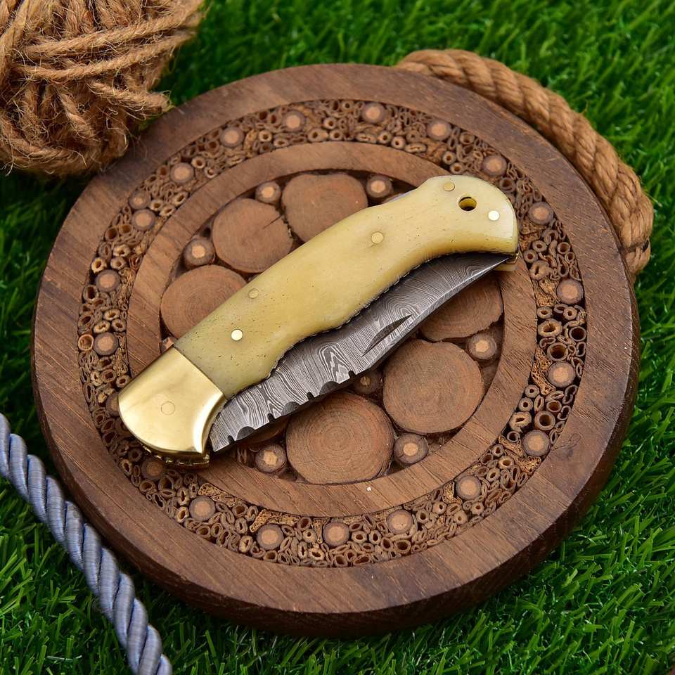 Cuchillo plegable de acero de Damasco hecho a mano con mango de madera de hueso de camello personalizable OEM regalo de padrino para él.