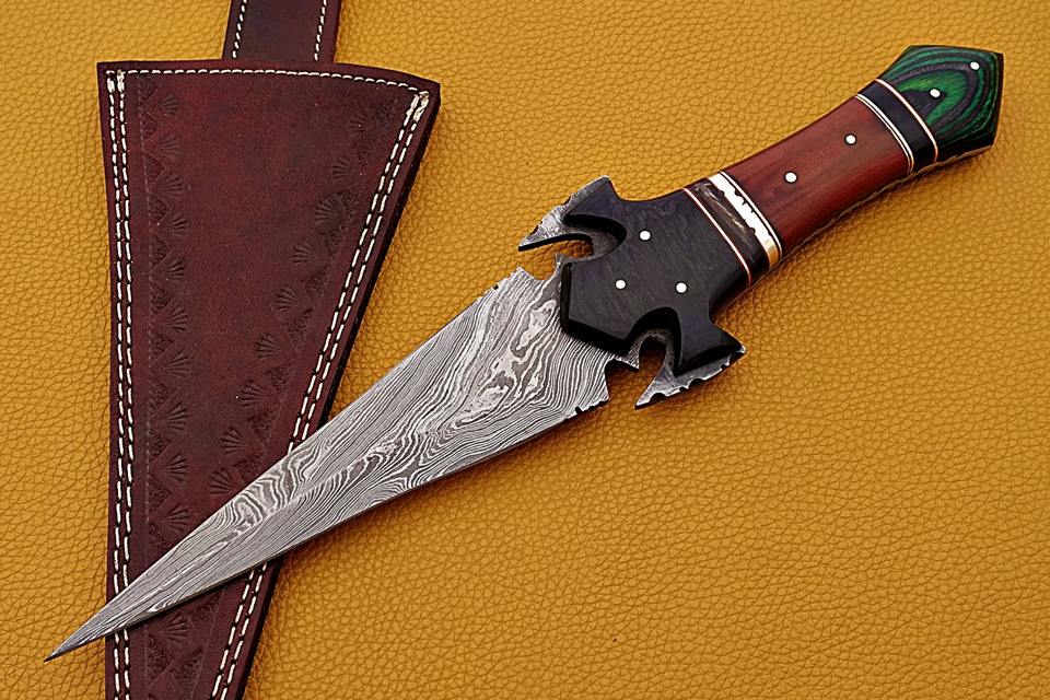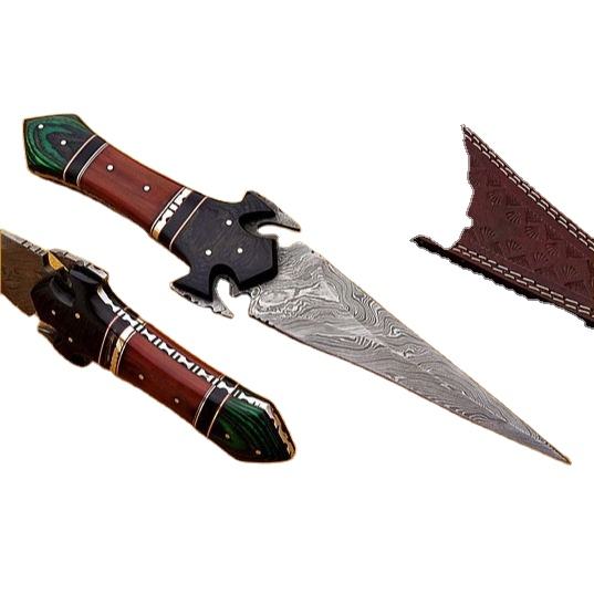 Cuchillo de Caza Hecho a Mano de Acero de Damasco con Mango de Madera Pakka, Funda de Cuero Fino, Uso Industrial al Aire Libre, Cuchillo de Supervivencia al por Mayor