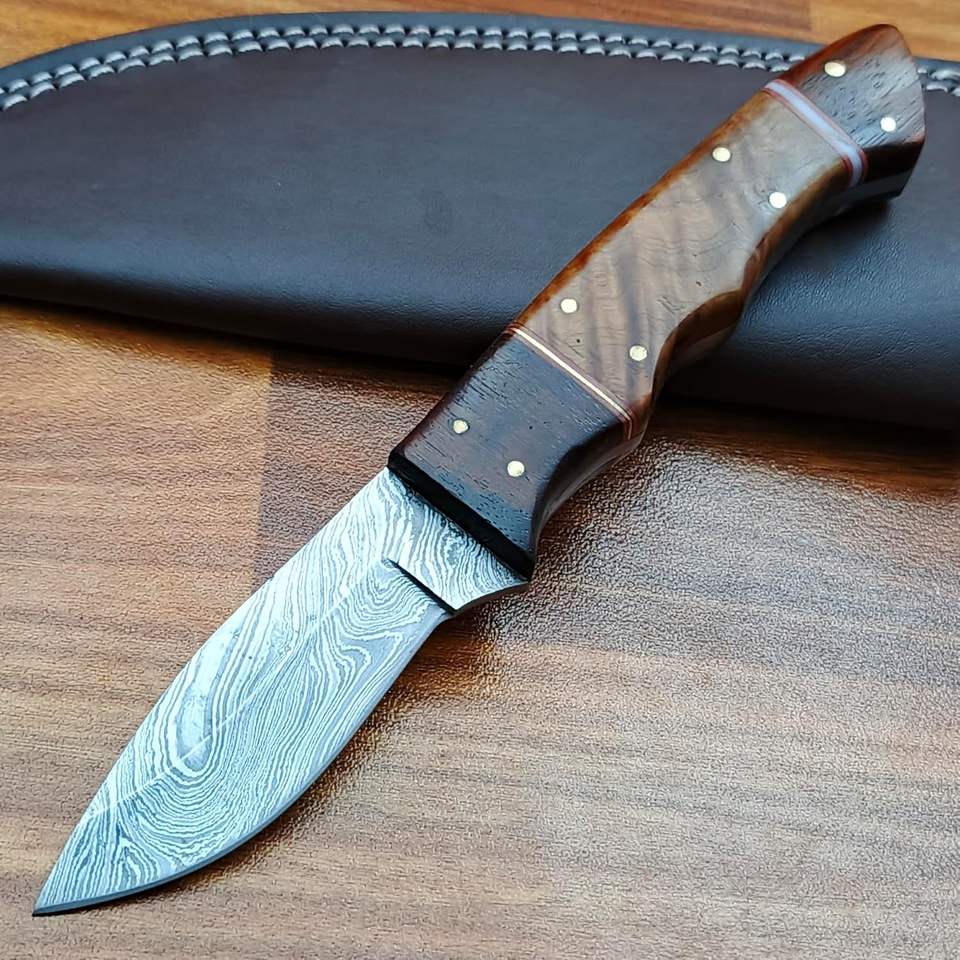 Cuchillo de caza hecho a mano de acero de Damasco con Funda de cuero, ideal para picar, acampar, senderismo, hoja fija Tang completa, soporte OEM