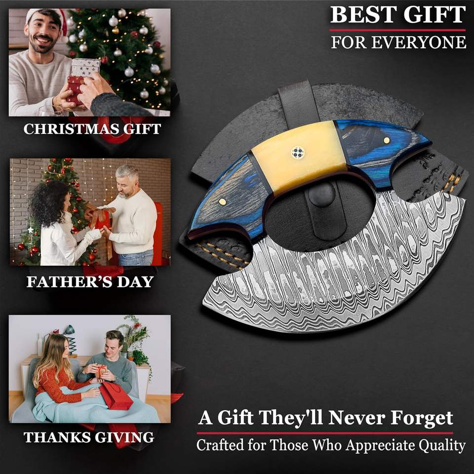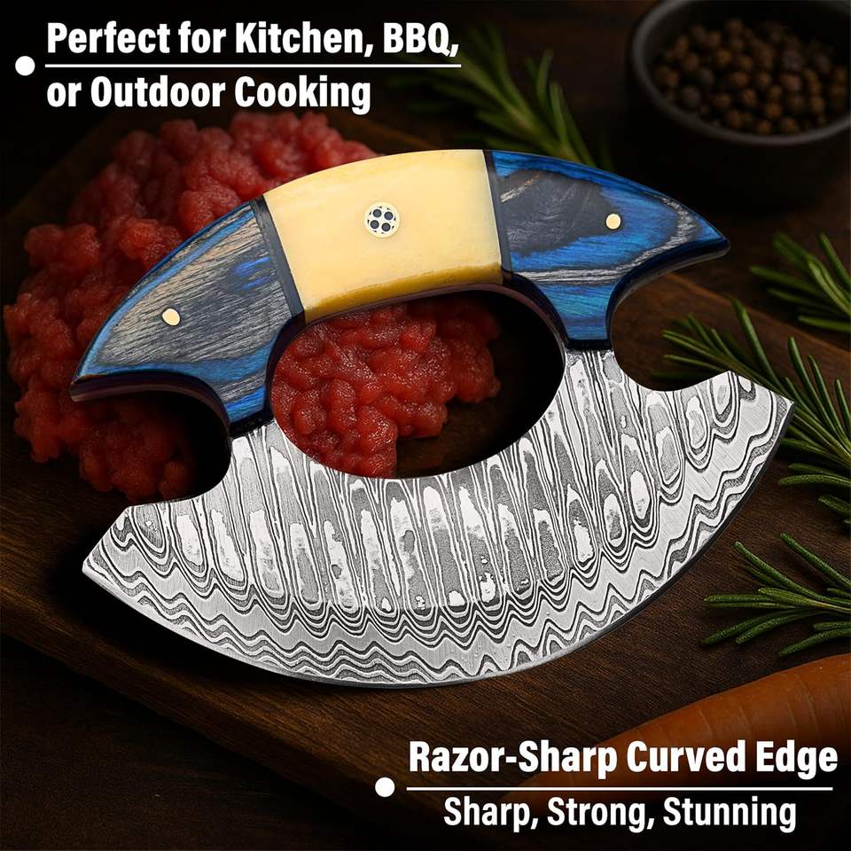 Cuchillo Ulu de Acero de Damasco Hecho a Mano, Cortador de Cocina, Cortador de Pizza, Proveedor OEM, Herramienta Premium para EE. UU. y la UE, Venta al por Mayor, Ambidiestro, con Funda de Cuero