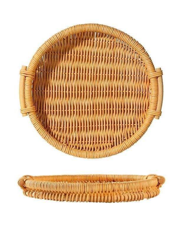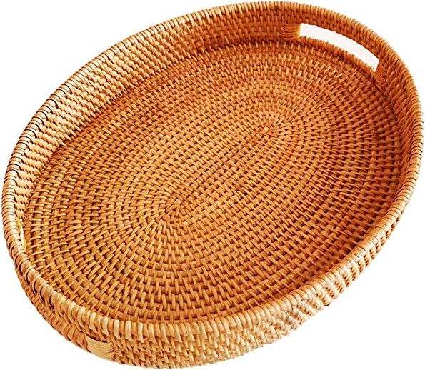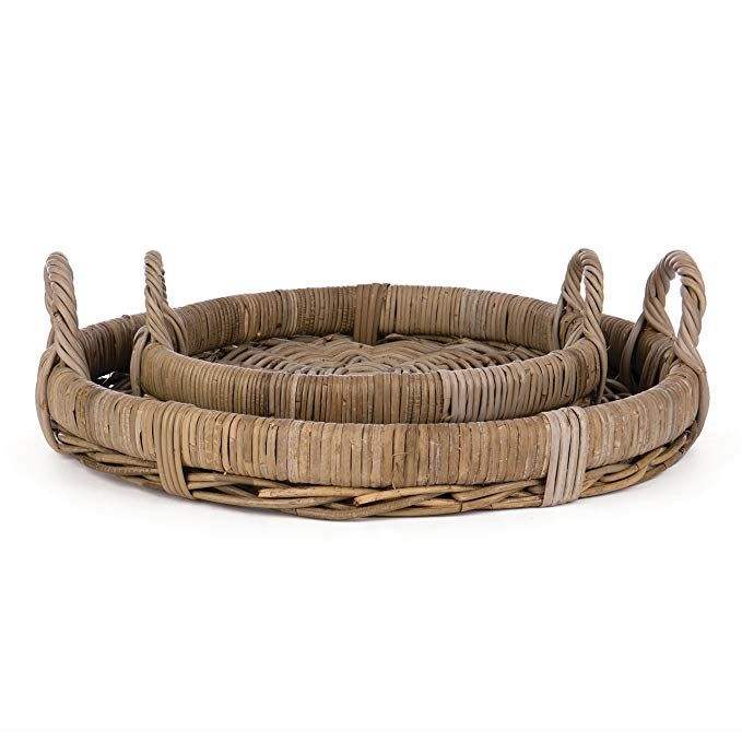 Bandeja de servicio de yute de ratán decorativa hecha a mano con acabado de incrustaciones de hueso Juego de 3 bandejas de servidor de alimentos de forma redondeada