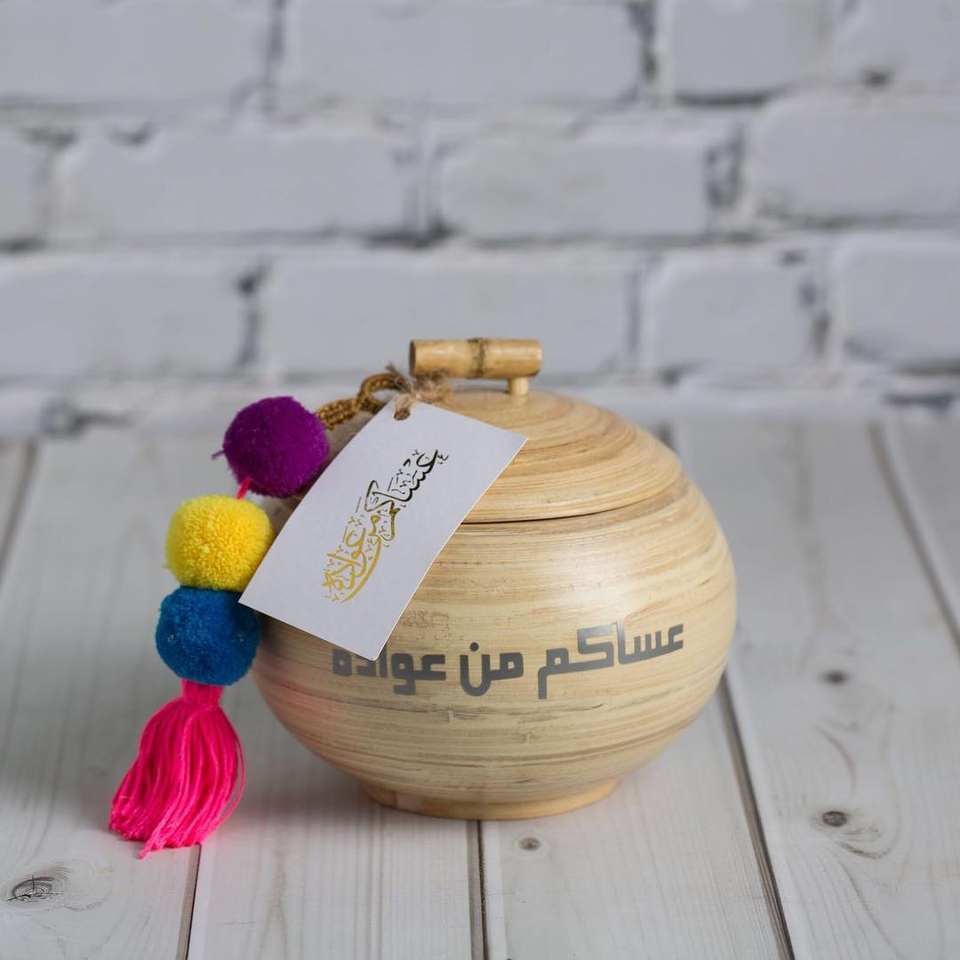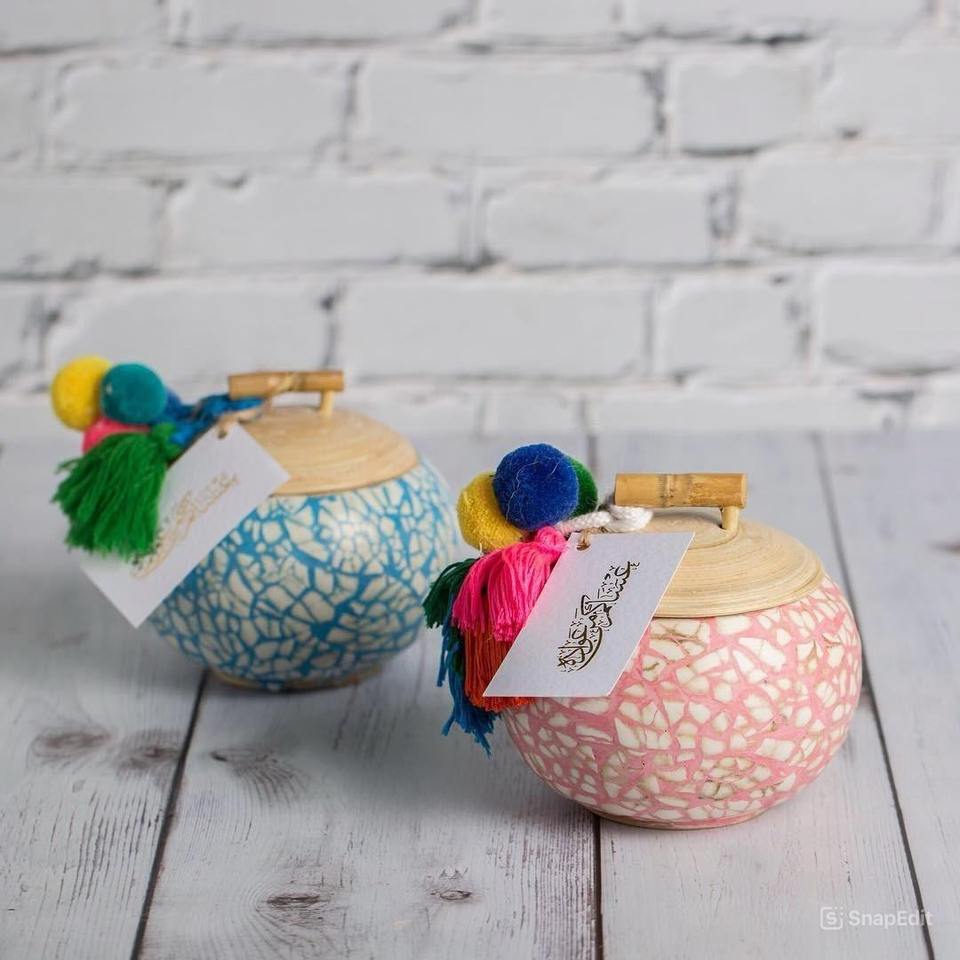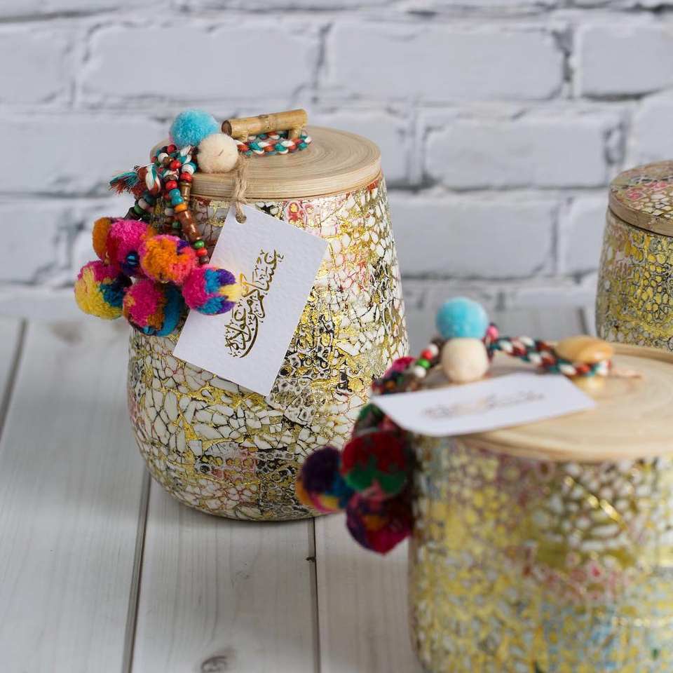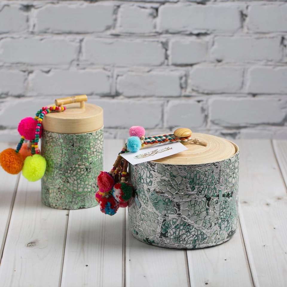 Tarro de almacenamiento decorativo hecho a mano con borla de colores en relieve caja de regalo de diseño dorado con tapa de bambú hecho en Vietnam