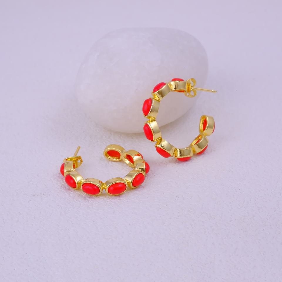 Pendientes de Aro de Coral Rojo Hechos a Mano con Diseño de Piedras Preciosas, Chapados en Oro, Joyería de Latón Ovalada, Piedra de Nacimiento de Moda, Venta al por Mayor, El Joyero Bezel