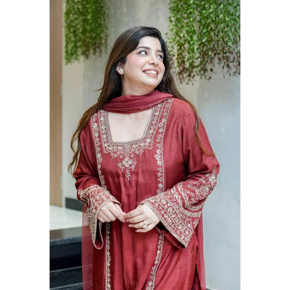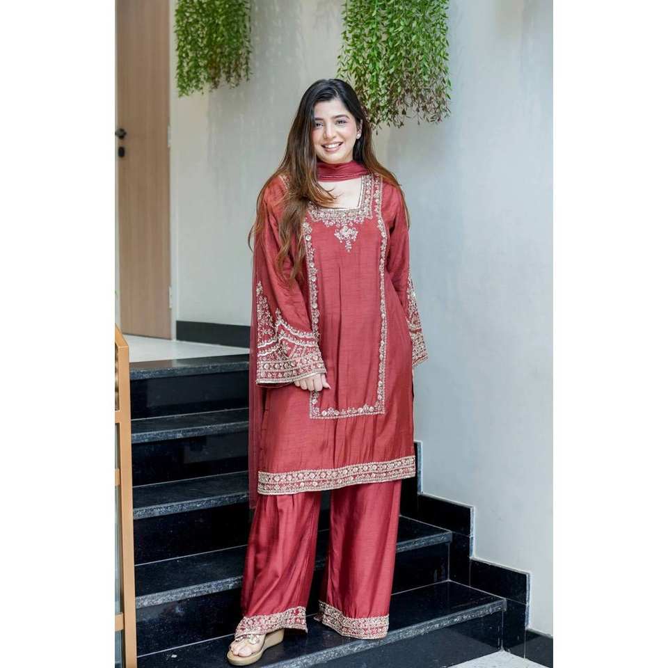Conjunto de Top, Pantalón y Dupatta con Bordado de Diseño Artesanal, Silueta Recta y Cintura Natural