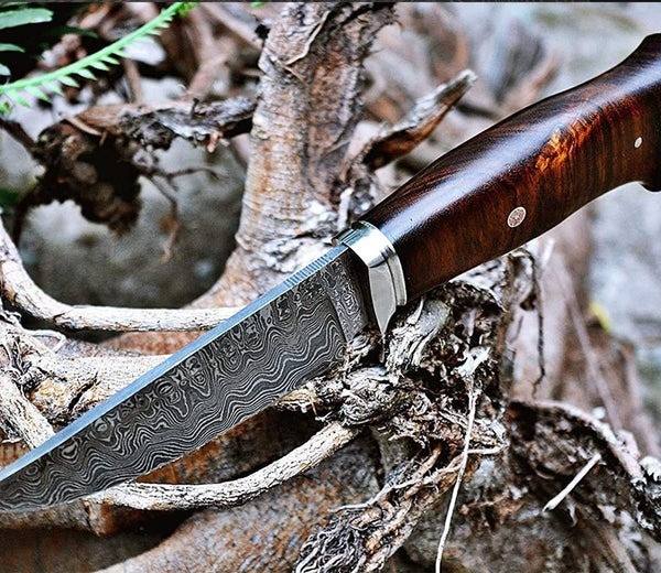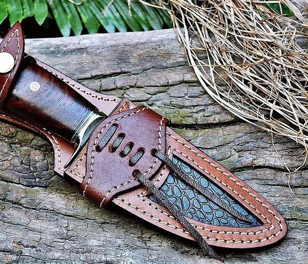 Cuchillo de caza hecho a mano con hoja de acero de Damasco, mango de madera y funda de cuero. Compatible con ODM.