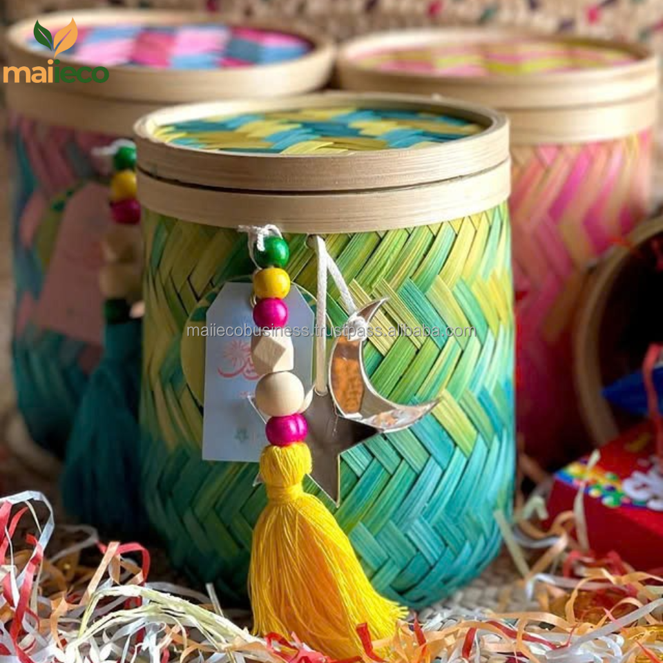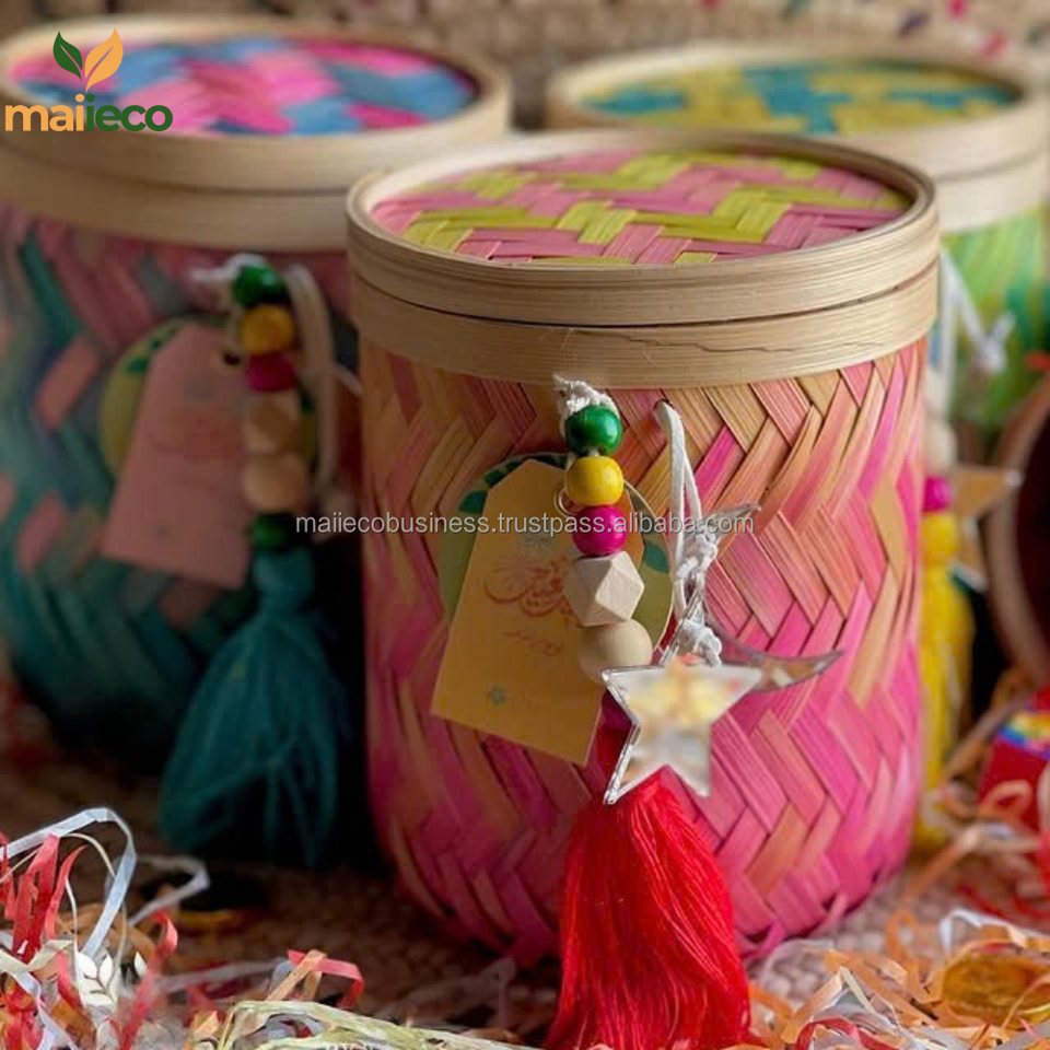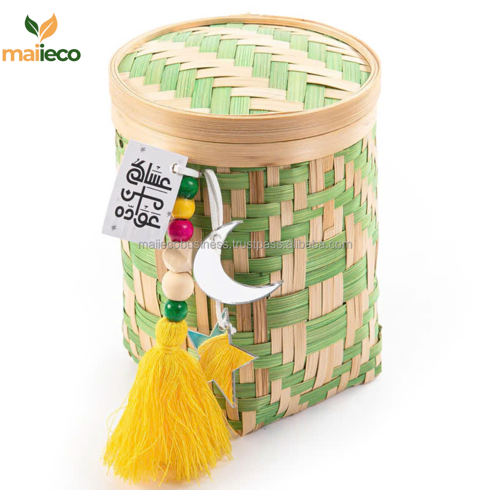 Caja de regalo de bambú ecológica hecha a mano, cesta de Ramadán con forma circular con tapa, bambú Natural decorativo para regalos, estilo Vintage