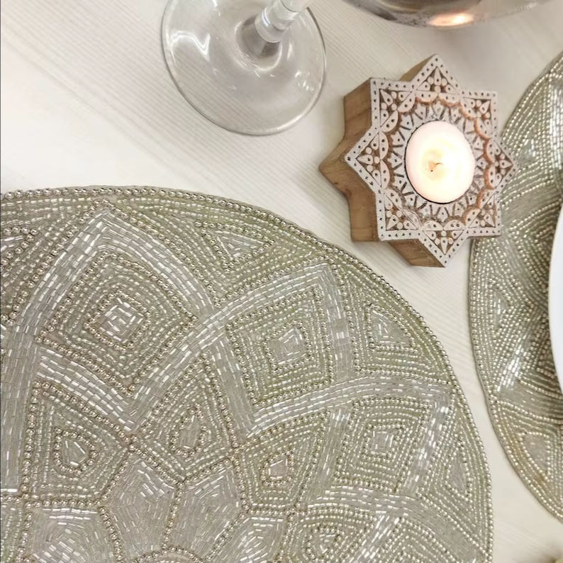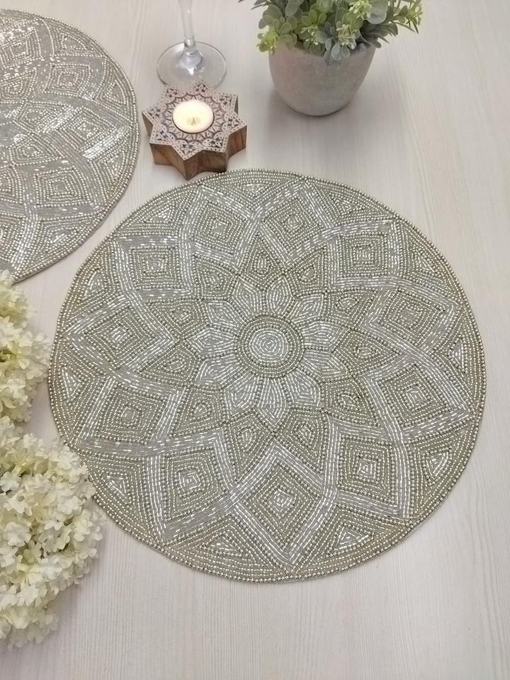 Salvamanteles Artesanal Ecológico con Cuentas, Base Resistente al Calor, Cuentas de Vidrio Blanco Genuinas, Posavasos, Tamaño Personalizado, Moderno para Hogar y Hotel
