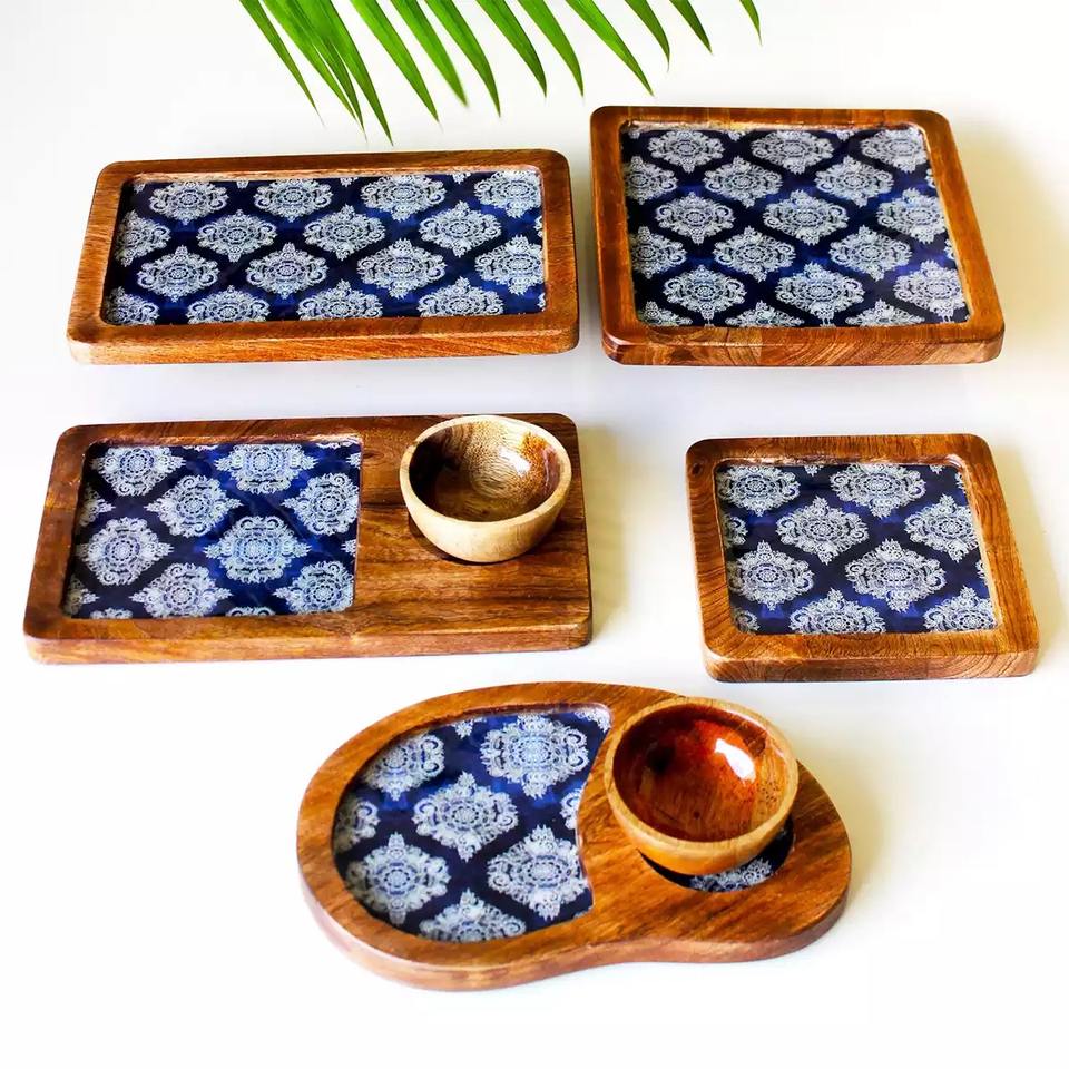 Juego de Bandejas de Madera Ecológicas Hechas a Mano con Estampado de Esmalte Azul para Bodas y Diwali, Incluye Bandejas Rectangulares y Ovaladas para Salsas