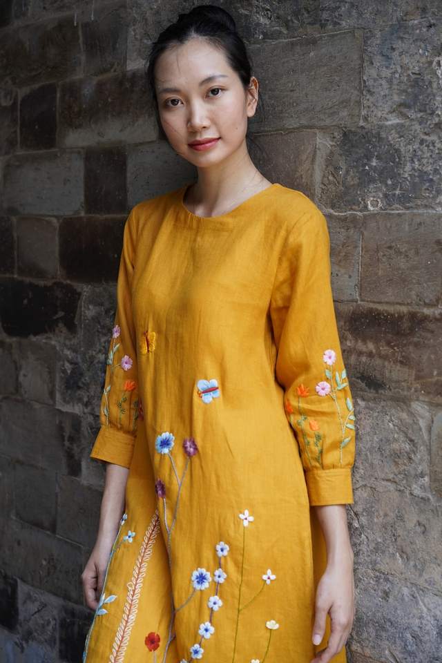 Vestido de lino bordado hecho a mano Vestido de invitados de boda manga larga floral DARIA