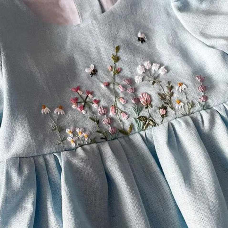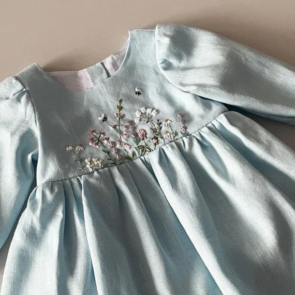 Vestido de lino suave bordado hecho a mano para niñas, estilo informal para el primer cumpleaños de niños pequeños, OEM hecho en Vietnam