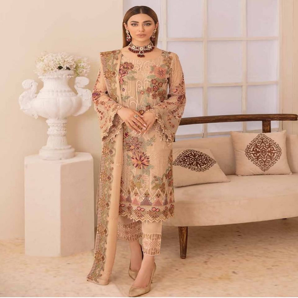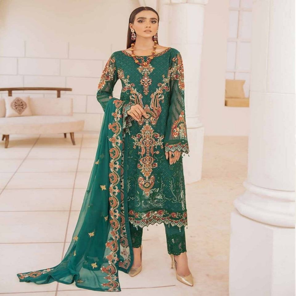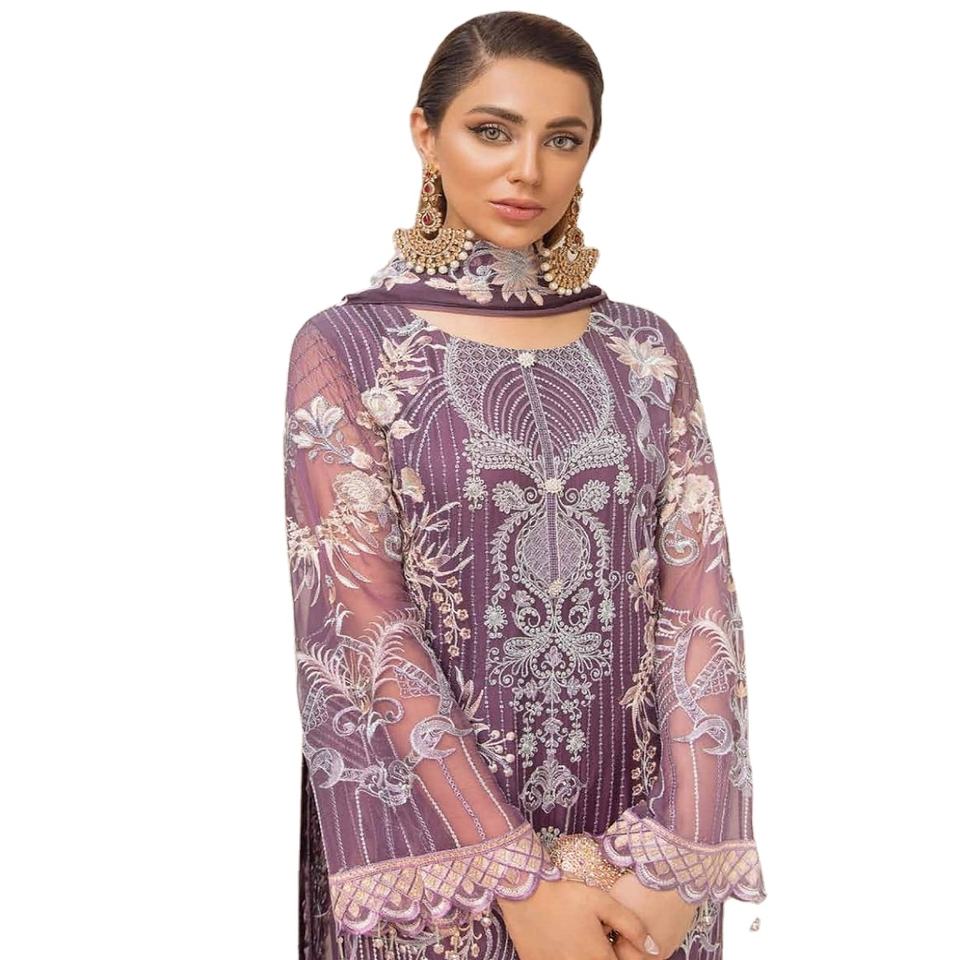Hecho a mano Heavy Chevron bordado de lujo de 3 piezas desgaste de fiesta en gasa indio paquistaní Ramsha trajes de volumen