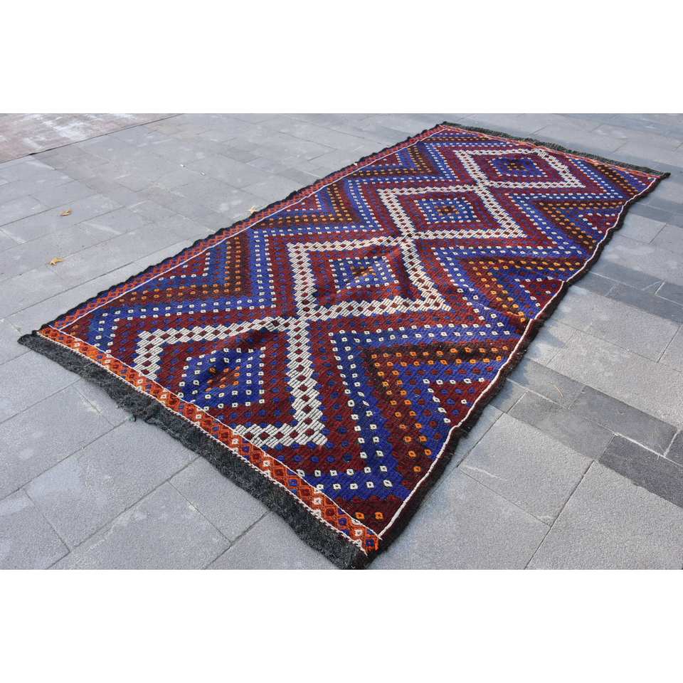 Alfombra de lana roja y negra étnica hecha a mano de 5,4x11 pies, alfombra turca para sala de estar, látex para casa con rectángulo a rayas de retazos