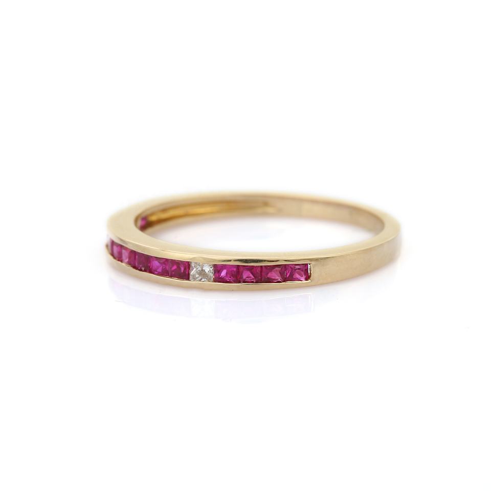 Anillo de Media Eternidad con Rubí Cuadrado Natural y Diamantes, Joyería Fina Hecha a Mano, Oro Amarillo Sólido de 14K, Anillo de Piedras Preciosas para Mujeres y Hombres