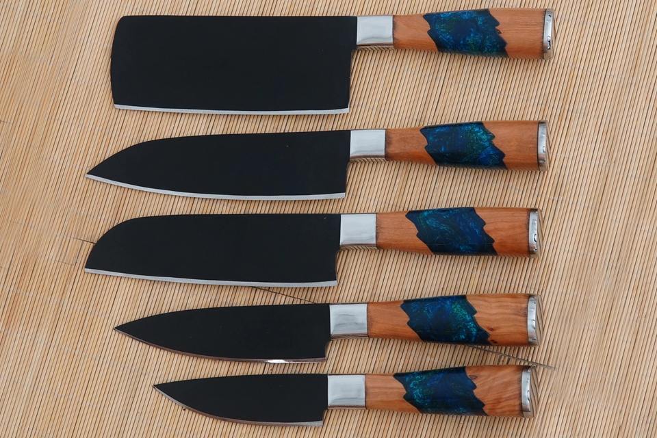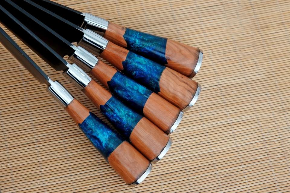 Juego de Cinco Cuchillos de Chef Hechos a Mano en Acero al Carbono con Mangos de Resina Ambidiestros y Capa de Acero de Damasco, Incluye Estuche de Cuero Enrollable
