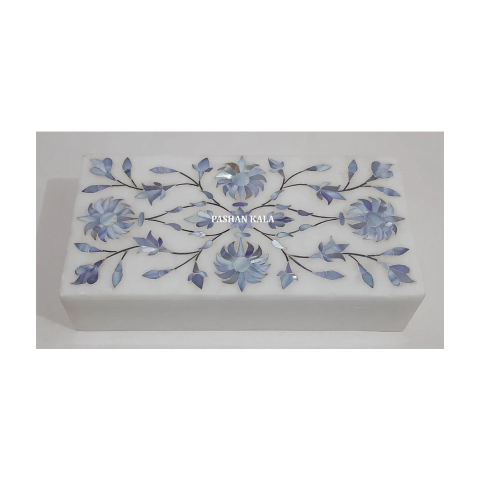Caja de joyería con incrustaciones de madreperla azul de mármol blanco con diseño de flores hechas a mano, forma Rectangular utilizada para decoración del hogar y regalos