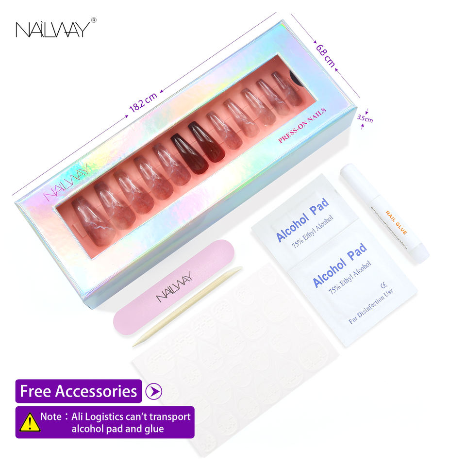 Detalles del embalaje:24 unids/caja + pegatina adhesiva/pegamento para uñas + 1 palo de madera + 1 almohadilla de Alcohol + 1 lima de uñas
