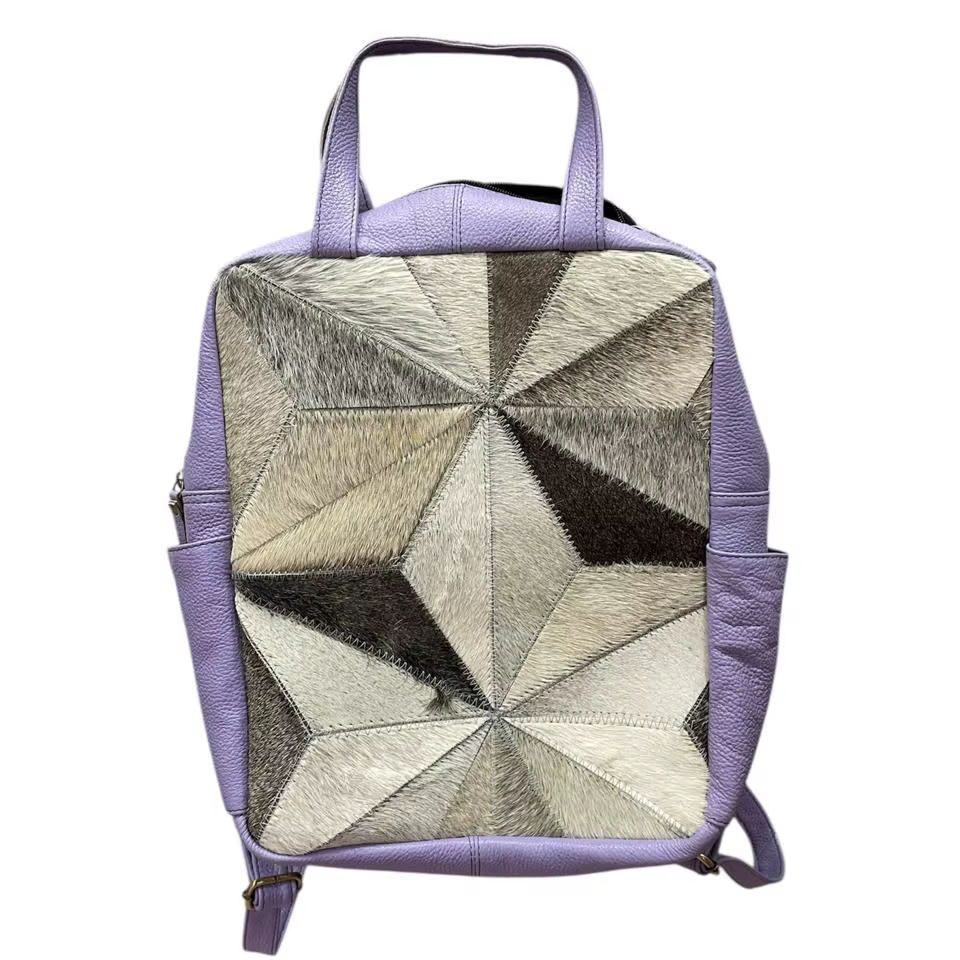 Silla de montar western de cuero de caballo hecha a mano, color lavanda púrpura, con retazos de cuero de vaca con pelo y patrón geométrico, cuadrada, para uso ecuestre.