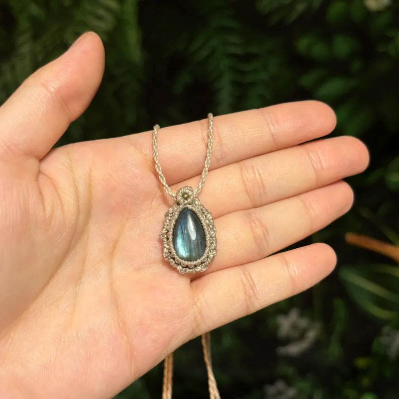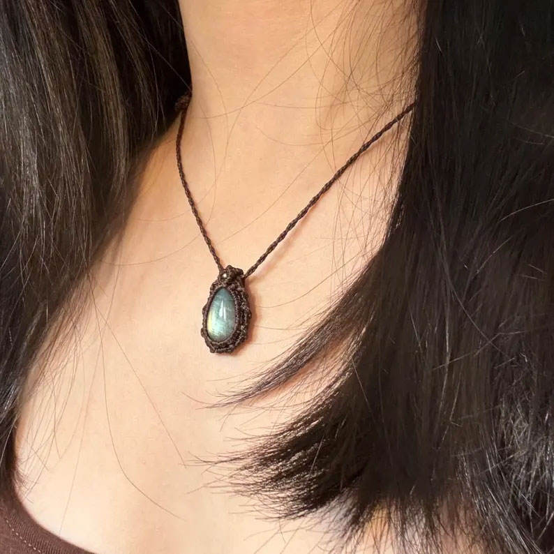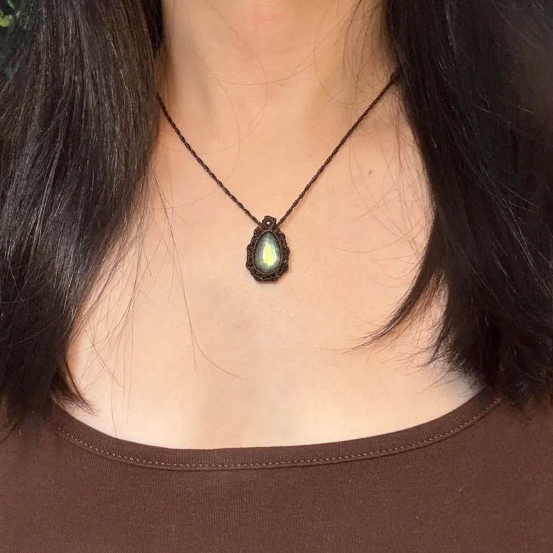 Collar Colgante de Macramé con Labradorita Verde Hecha a Mano, Cordón Marrón, Gema Natural, Cristal Curativo Boho, Joyería Ajustable