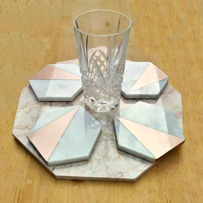 Juego de Posavasos Hexagonales de Mármol Hechos a Mano con Detalles en Oro Rosa, Posavasos de Piedra, Regalo de Lujo, Decoración del Hogar, Accesorios para Mesa de Centro