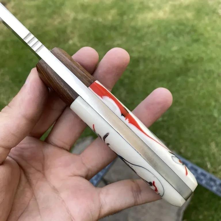 Cuchillo de Caza Hecho a Mano, Hoja Recta, Punta Caída, Acero Inoxidable, Mango de Resina y Madera, Funda de Cuero, 4mm de Grosor, 3 Años de Garantía