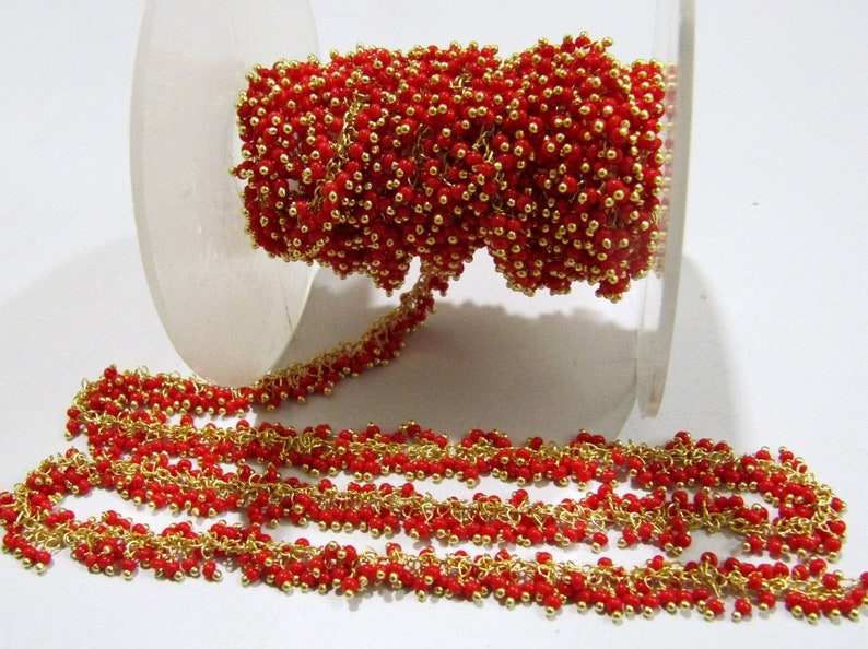 Racimo de cuentas de cuarzo hidráulico hecho a mano, cuentas lisas de 2mm por pie, cadena envuelta en alambre de latón alto, colgante de Coral rojo, hallazgos de 3mm y 4mm