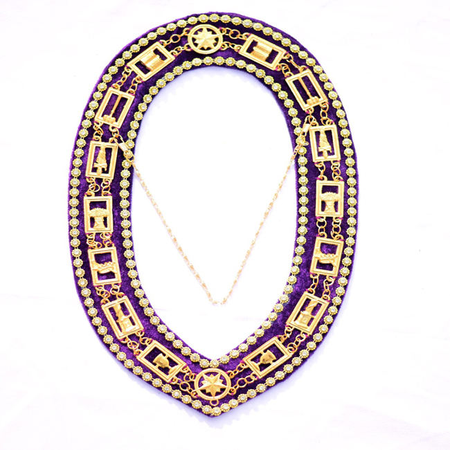 Collar de Cadena Masónica Hecho a Mano con Intrincados Bordados en Punto de Cruz, Metal Chapado en Oro con Pedrería, Artesanía Personalizable