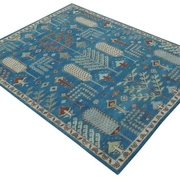 Alfombra Oushak azul marfil hecha a mano, alfombra de lana de algodón de alta calidad, puerta de casa de larga duración, diseño abstracto, hermosa pieza caliente