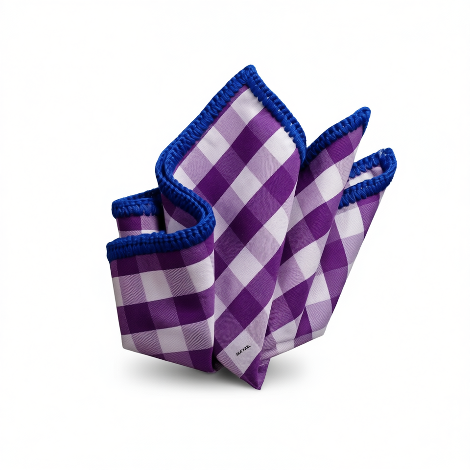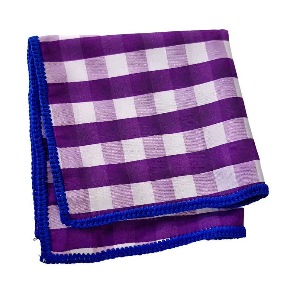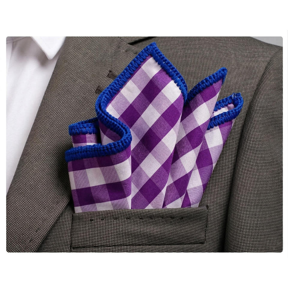 Pañuelo de bolsillo hecho a mano con borde de punto exclusivo, a cuadros morados con borde azul, para blazers y ropa formal de comedor