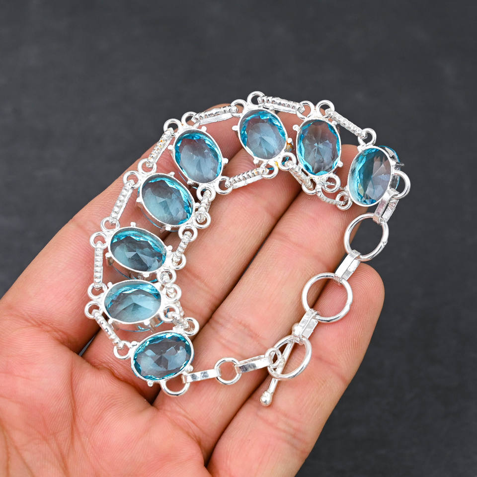 Pulsera de piedras preciosas de Topacio Azul creada en laboratorio hecha a mano, cadena chapada en plata 925, estilo de diseñador, joyería de 7 a 8 pulgadas, regalo para ella