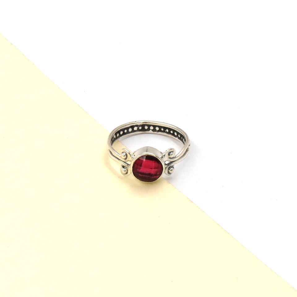 Anillo Boho Hecho a Mano con Gema Rosa Fucsia Creada en Laboratorio, Corte Checker Geométrico, Bañado en Plata con Acabado Mate
