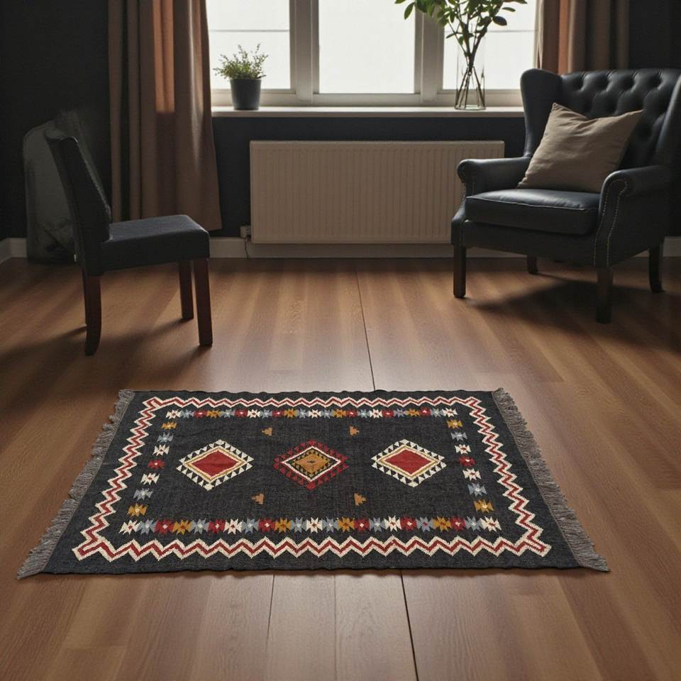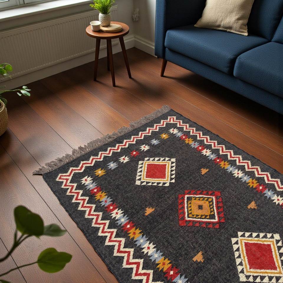Alfombra Kilim Grande Hecha a Mano, Patrón Geométrico, Lana y Yute, Motivos Tradicionales Indios, Tejida a Mano, Dhurrie Oriental, Lavable, Pelo Mediano