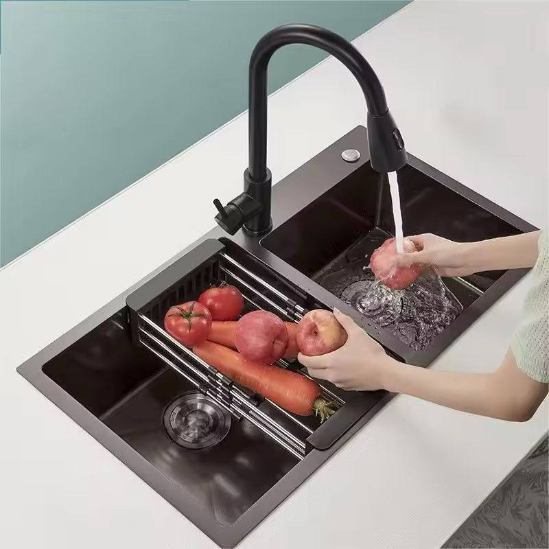 Juego de fregadero de cocina de un solo tazón grande hecho a mano con grifo de acero inoxidable 304, lavabo para lavavajillas vegetal grueso, fregadero individual