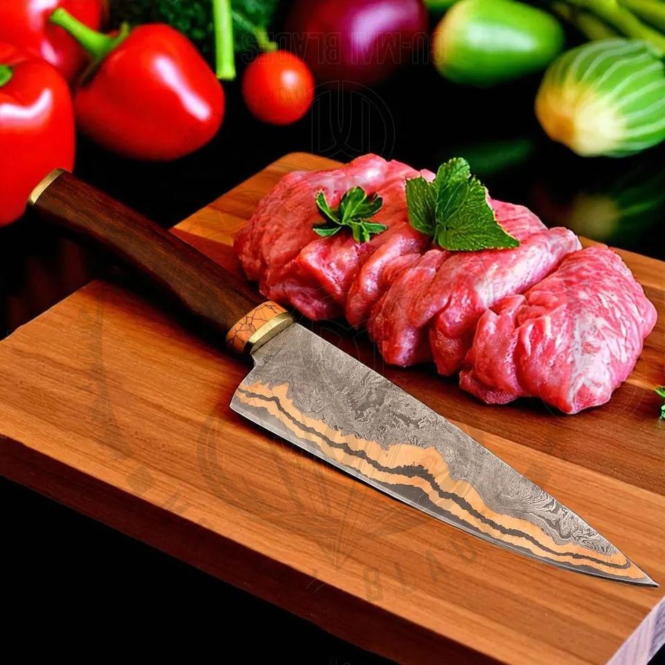 Cuchillo de Chef de Lujo Hecho a Mano con Mango Turquesa, Cuchillo de Cocina con Hoja de Cobre y Damasco para Regalo de Aniversario y Navidad