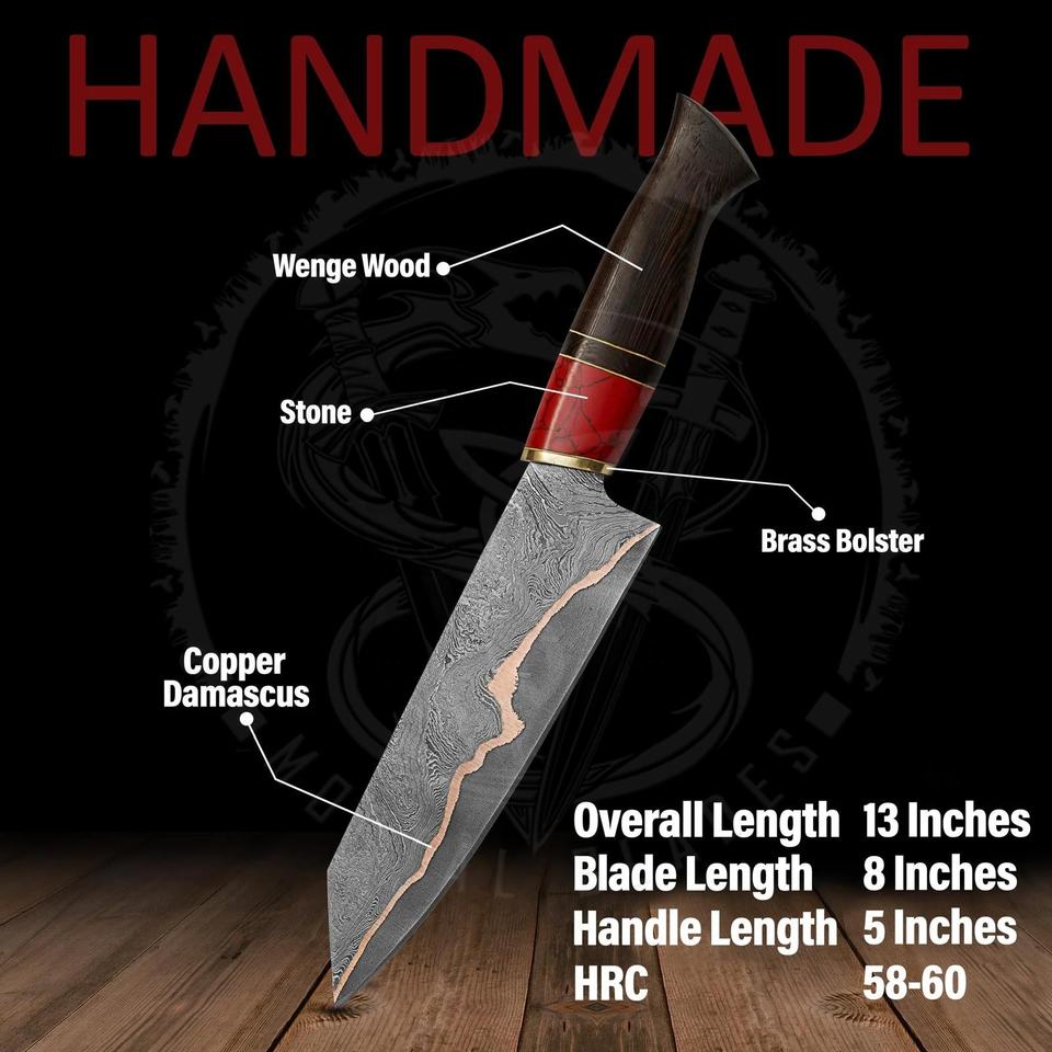 Cuchillo de Cocina de Lujo Hecho a Mano con Hoja de Cobre y Damasco, Cuchillo de Chef con Mango Turquesa para Aniversario, Regalo de Navidad con Funda