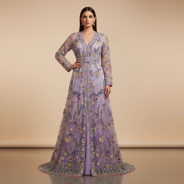 Kaftan de fiesta de lujo hecho a mano bordado 3D diamante cristal encaje decoraciones imperio cintura recta frente vaina vestido