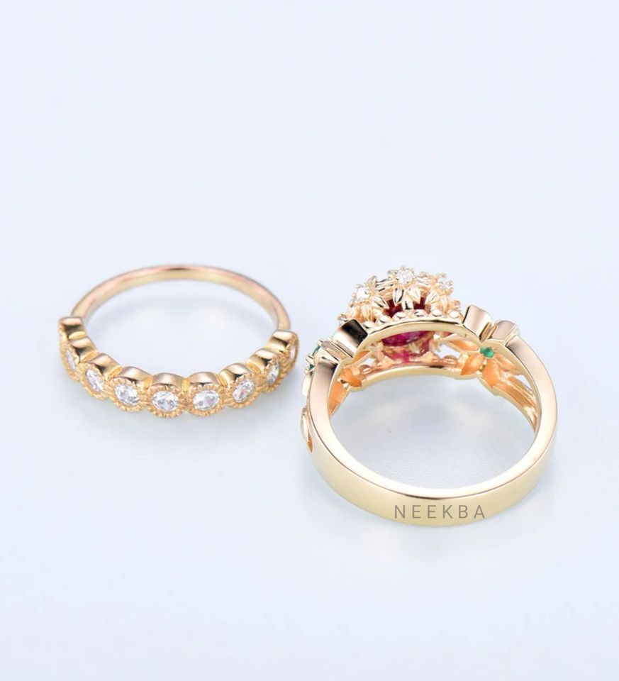 Conjunto de anillo nupcial de rubí de lujo hecho a mano-Anillo floral de rubí único emparejado con banda apilable de moissanita, anillos finos de oro sólido de 10K