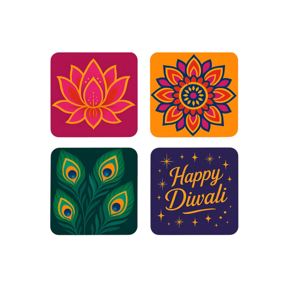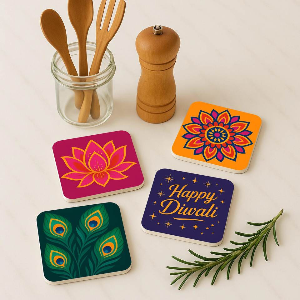 Juego de Posavasos Coloridos de MDF Lacado Hechos a Mano para Diwali, Resistentes al Calor, Cuadrados, Personalizables, Regalo Festivo para el Hogar, en Caja