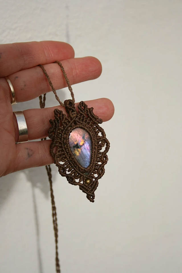 Collar de Macramé Hecho a Mano con Colgante de Labradorita, Piedra Brillante, Cordón Marrón Ajustable, Joyería Artesanal con Propiedades Curativas