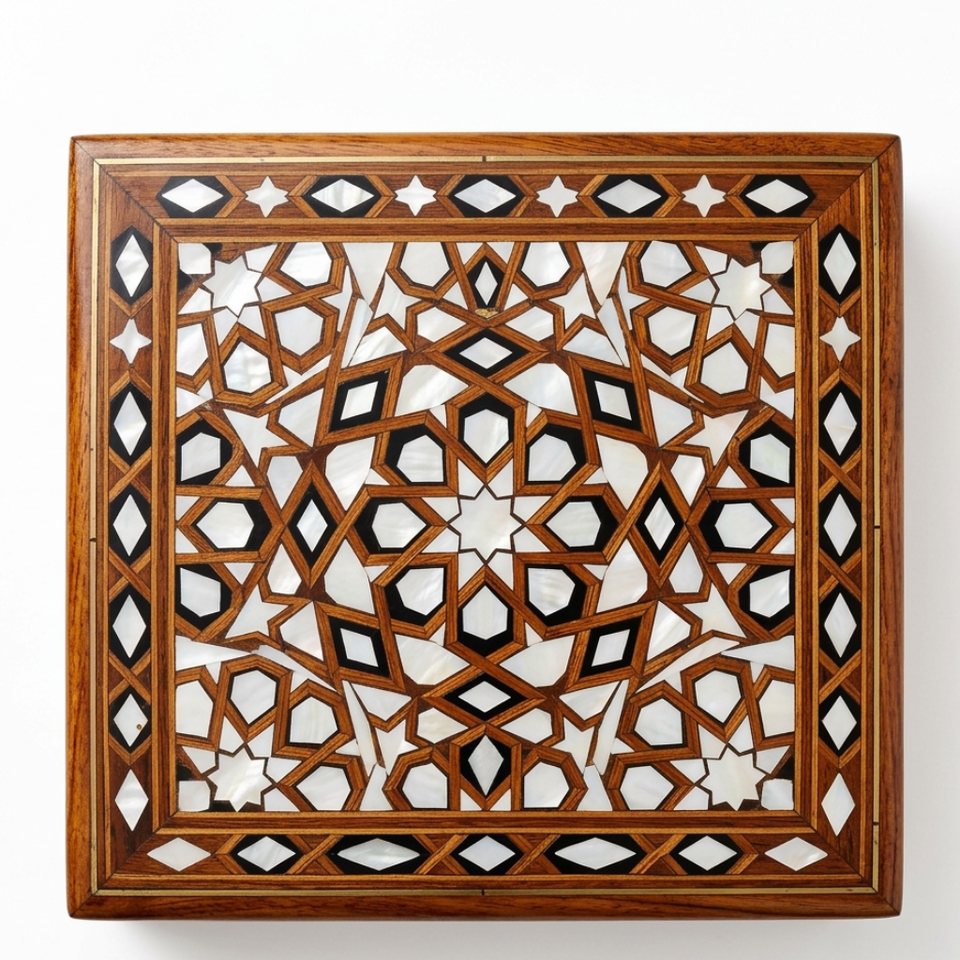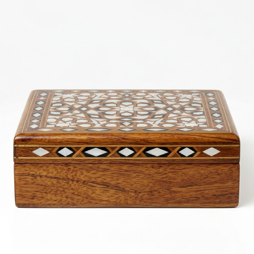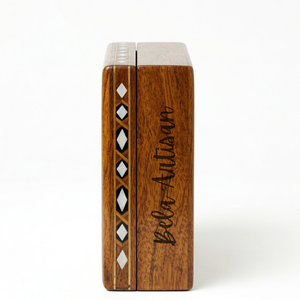 Caja Decorativa Cuadrada Hecha a Mano por Artesanos de Bela, con Incrustaciones de Madera de Mango y Detalles Geométricos de Latón, para Almacenamiento de Objetos Valiosos en la Cocina o Sala de Estar