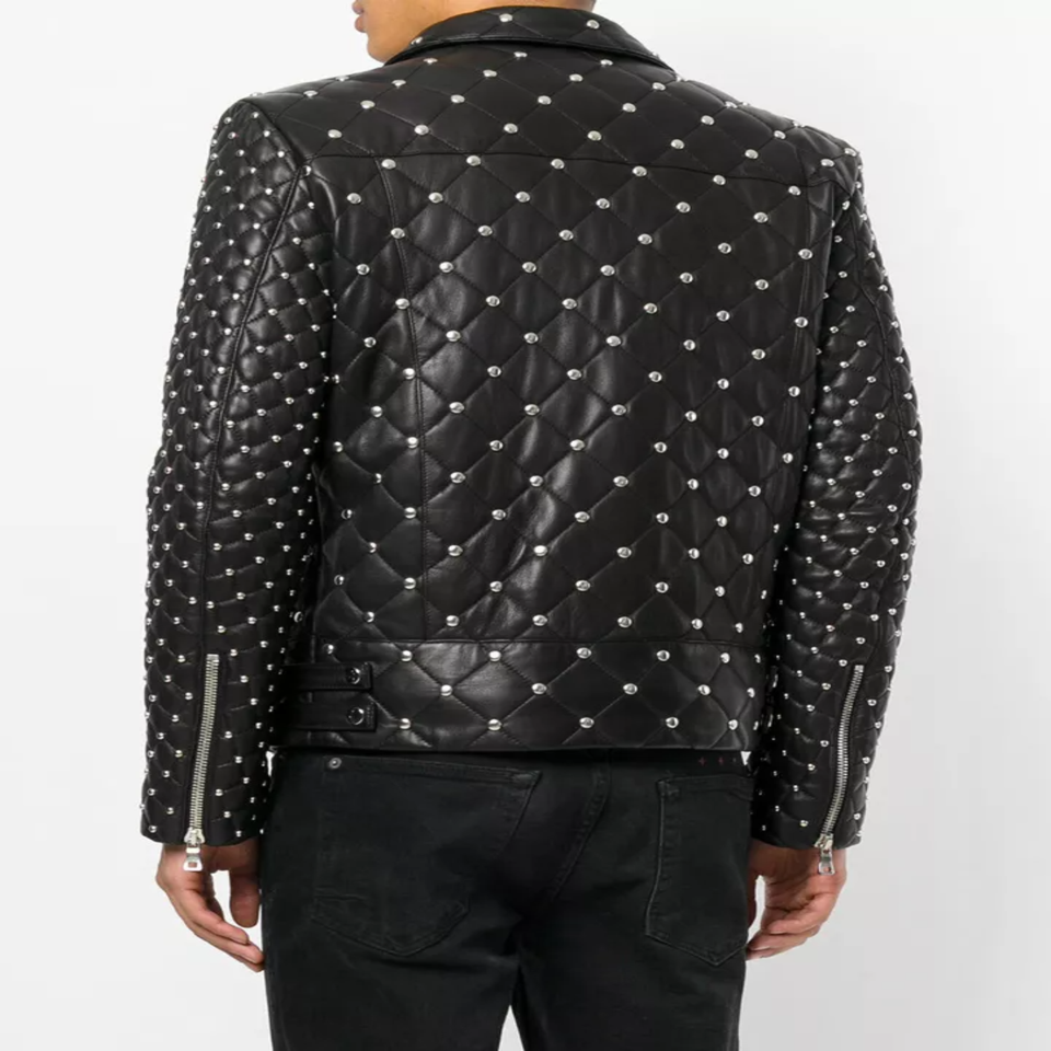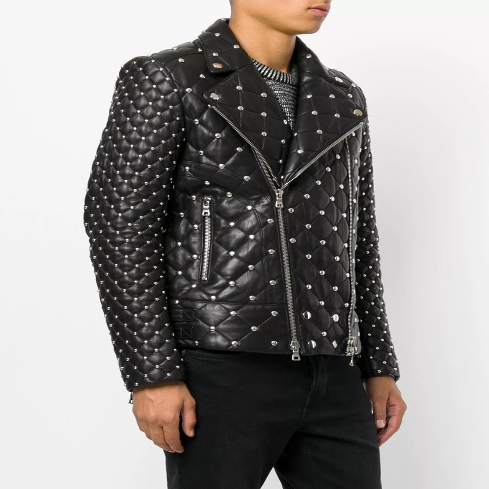 Chaqueta de cuero genuino estilo motorista hecha a mano para hombre, negra con puños con cremallera y detalle de tachuelas, abrigo de invierno a la moda