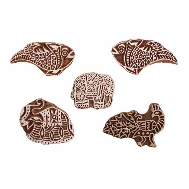 Juego de 5 bloques de impresión de madera con patrón de peces y elefantes