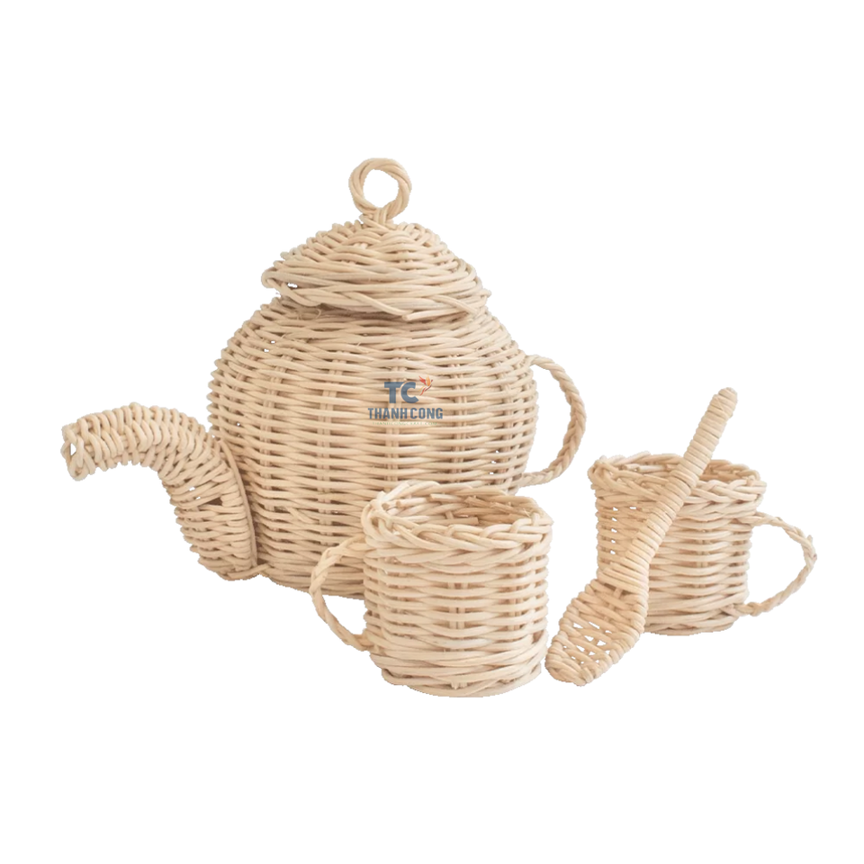Juego de té de ratán de diseño moderno hecho a mano para niños, dormitorio y sala de estar, incluye tetera, taza de juguete y muebles de muñeca para bebés