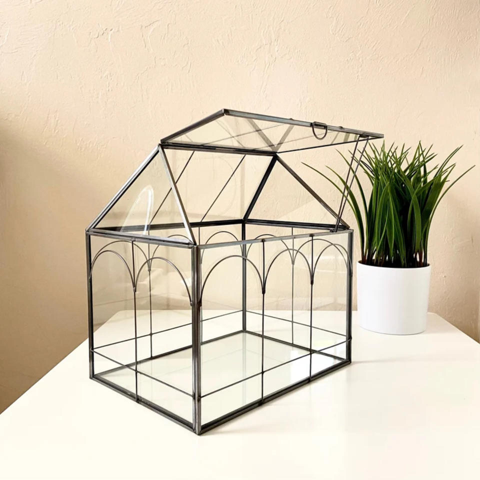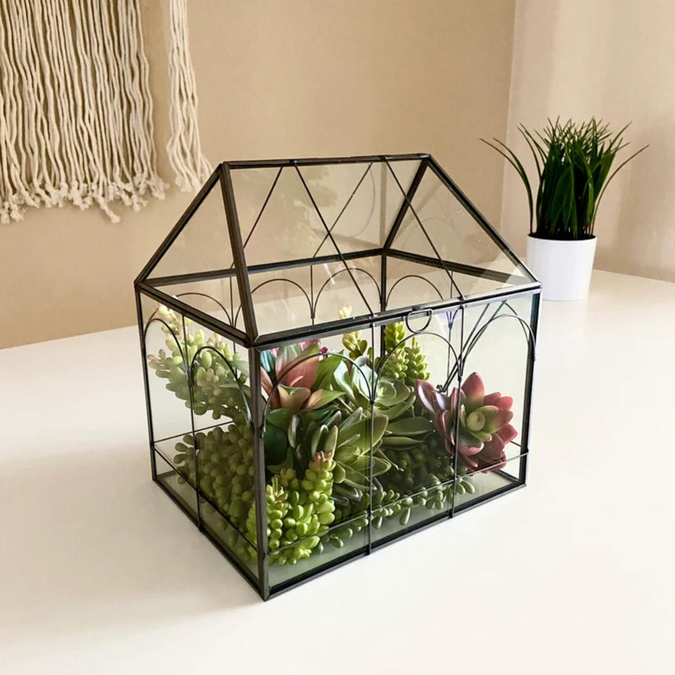 Hecho a mano moderno geométrico terrario tamaño personalizado AK artesanías Popular hogar boda decoración Metal exterior piso florero vidrio