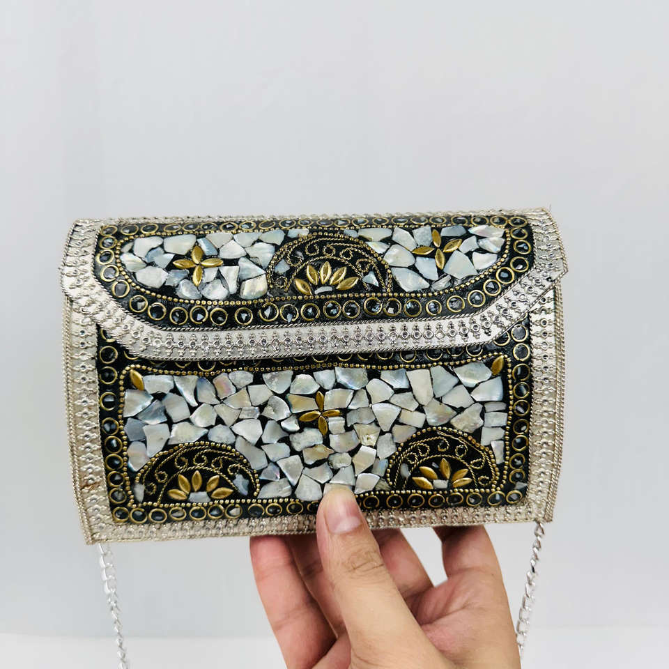 Bolso de noche nupcial antiguo de lujo moderno hecho a mano con incrustaciones de mosaico de perlas madre escultura para fiesta de boda bolso de Metal chapado en oro